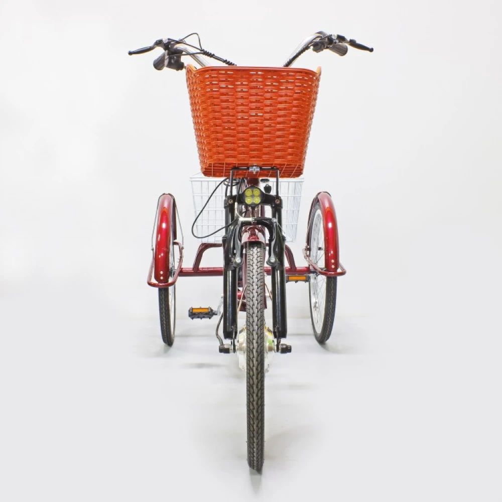 Электровелосипед представлен компактными эргономичными характеристиками, предназначен для ежедневных прогулок и грузоперевозок. Трехколесная модель оснащена всем необходимым для комфорта и удобства. Оснащена 2 компактными корзинами, первая из которых выглядит модно и привлекательно, а вторая – вместительная. Модель оснащена удобным регулируемым сиденьем, повторяющим анатомические части тела ездока, снимающая нагрузку с позвоночника, не допускающая усталости при длительной езде.